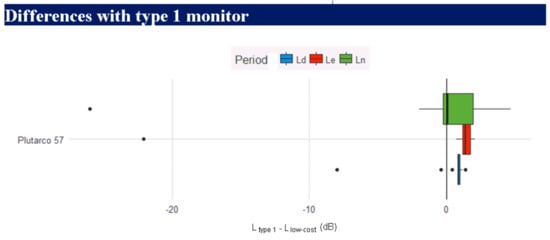 The report also shows box plot figures with the measurement difference between a type 1 instrument and a low-cost instrument. Figure 13 shows a diagram for the equipment placed on Plutarco Street. We can see that there is a greater dispersion in sound levels at night, which is due to the minimum value of the dynamic input range of the instrument. The figure also shows the outlier values, where one can see the low outlier numbers over three months.