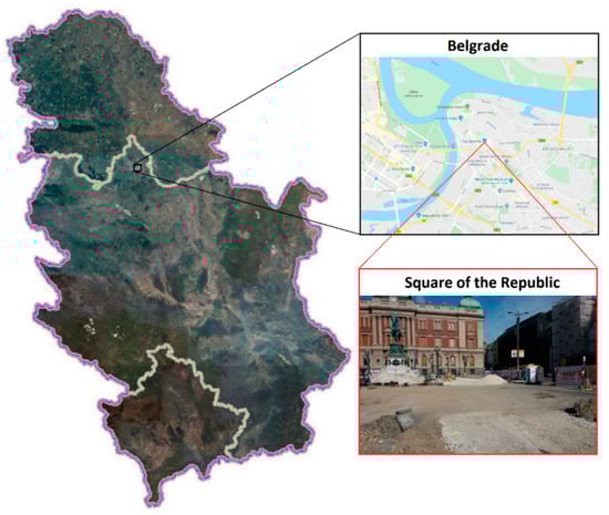 The survey was carried out in Square of the Republic, located in Belgrade, Serbia, which is in the very centre of the city (Figure 1). The square hosts some of the city’s important public buildings, including the National Museum, the National Theatre, and the statue of Prince Michael. The goal of the GPR survey was to find and localize the buried remains of the Stambol Gate foundations in the subsurface of the Square of the Republic.