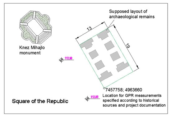 The centre of Belgrade is a complex urban area where the development of human society went through several stages, in different epochs of history. Some events that happened during the 18th century are of particular interest for the GPR study presented in this paper. In that period, after the war between the Austrian and Ottoman Empire, Belgrade was run by Austrians. A typical baroque gate was built in 1725 as part of the city defense system and it was named after Carl Alexander von Württemberg, who governed the city and the Kingdom of Serbia from 1720 until 1733. Subsequently, the Kingdom of Serbia was governed by Karl Christoph von Schmettau (1733–1738), by George Oliver de Wallis (1738–1739), and between 1739 and 1806 Austrians and Ottomans switched in running the city of Belgrade several times. After the Austrian army was defeated in the battle near Grocka, in 1739, Austria agreed to sign a truce. Austrians insisted on demolishing all objects and fortifications built in the period of their rule. In June 1740 an agreement was signed, and many constructions were demolished, including the Württemberg Gate. From the available descriptions, it is known that Württemberg Gate was large and monumental, but there are no surviving illustrations, so the exact appearance of the gate is unknown.