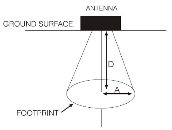 - Calculation of PS based on the antenna footprint (Figure 3)–In this method, the calculation of the antenna footprint at a given depth is used to choose an appropriate spatial resolution. In particular, the radius of the antenna footprint is the minimum value of PS that guarantees full coverage of the area of interest at a given depth. Different equations can be used to estimate the antenna footprint, based on different empirical definitions of the Fresnel distance. According to []:and according to []:where A is the radius of the antenna footprint, λ is again the wavelength at the central frequency f of the used antennas, v is the wave velocity, D is the depth from the ground surface to the reflection surface where the antenna footprint is calculated, and εR is the average relative dielectric permittivity of the material from the ground surface to the depth D. For the antennas used in this paper and given conditions in the field, the resulting values of A when D = 1 m and D = 2 m are reported in Table 1. The expected depth of the sought targets was between 0.5 m and 1.8 m, and the values of A at 1 m and 2 m, according to equations (1) and (2), were between 0.37 m and 0.8 m. These results confirm that PS = 0.5 m is a reasonable value.