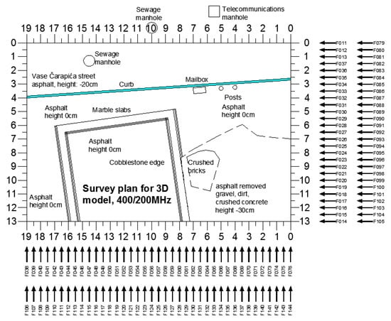 The GPR scanning plan, with marks of radargrams recorded using both sets of antennas, is shown in Figure 4; the radargrams were recorded using a fixed starting line per axis, to minimize the profile georeferencing error in the 3D models. Since data were to be used to create 3D models, all GPR settings were the same during all acquisitions with a given set of antennas. Figure 5 consists of photos taken during the measurements, with both antennas. The survey was planned and executed taking into account the practical recommendations given in [,] for a safe use of GPR during near-surface geophysical archaeological prospection.