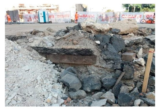 Several obstacles were present in the survey area, such as curbs and street lighting posts. In a region of the surveyed zone, the surface layer had already been removed down to a 0.5 m depth, making the acquisition of a few profiles more difficult (Figure 6). In the first 60 cm of the subsurface, the following layers were present: cobble/marble plate, about 8 cm thick; base layer, about 8 cm thick; asphalt, about 6 cm thick; wooden cubes, about 11 cm thick; concrete, about 20 cm thick; these layers were followed by the soil.