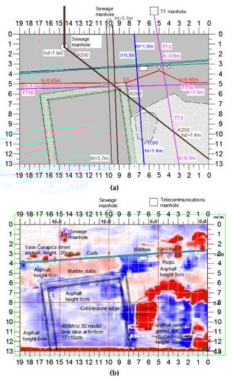 (a) Map of the survey area, where all the existing utilities were drawn and marked. (b) Ground-surface features affecting the GPR survey, overlapped with the 0-depth horizontal slice (ST = 16 cm, 400 MHz data).