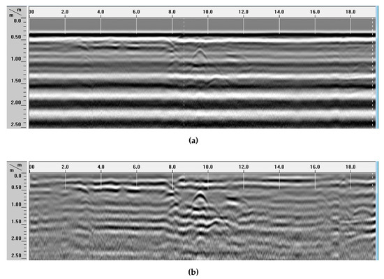 (a) Example of raw data collected with the 400 MHz antennas. (b) The same radargram as in (a), after the application of the editing and processing steps summarized in the text.