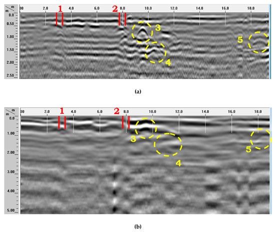 In B-Scans, several signatures were observed. Underground objects with circular cross section were detected and identified based on their hyperbolic signatures in the radargrams [,]. A comparative analysis of two radargrams collected along the same acquisition line by using 400 MHz and 200 MHz antennas is shown in Figure 9. In these B-Scan examples, several reflections can be seen: hyperbolas generated by circular-section utilities (indicated by 3 and 5, yellow circles); horizontal lines generated by surface layers, resulting from the antenna movement over the marble plates covering Square of the Republic (indicated by 1 and 2, red lines); and anomaly 4 (yellow circle), which looks similar to a hyperbola and is generated at the edge of the sought gate remains. The utility corresponding to anomaly 3 in Figure 9b is a waterline V1L80, buried at a depth of about 0.65 m; the utility corresponding to anomaly 5 is a telecommunication cable, buried at a depth of about 0.95 m. The anomaly generated by the edge of the gate wall is at a depth of about 1.45 m. Strong reverberation effects can be noticed in the B-Scans, too.