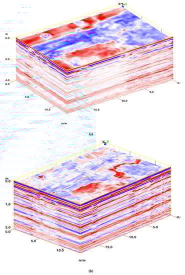 3D models, with C-Scans formed from radargrams acquired with 200-MHz (a) and 400-MHz (b) antennas.