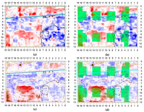 Maps (a) and (b) show the slice obtained at a depth of 80 cm from the 200-MHz data (ST = 33cm), with and without overlaid foundations in green, respectively. Analogously, maps (c) and (d) show the slice obtained at the same depth from the 400-MHz data (ST = 16 cm), with and without overlaid foundations in green, respectively.