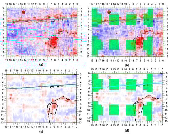 Four examples of slices are presented in Figure 11 and Figure 12, where the actual foundation remains have been overlaid to the field-amplitude maps as partially transparent green regions; on the vertical and horizontal axes of the maps, distances (in meters) are reported. The slices in Figure 11 correspond to a depth of 80 cm. Here, signatures were observed that could be ascribed to the remains of the foundations. By visually comparing the maps of Figure 11a,b with those of Figure 11c,d, the higher resolution achieved with 400-MHz antennas can be appreciated. In the lower regions of the slices, strong reflections can be seen. The reflection area in the left-bottom part of the slices coincides with the georeferenced outline of a foundation column. Another reflection area, with a few small breaks, is visible on the entire horizontal extension of both slices (from 8 m to 10 m on the vertical axis); according to the cadastre data, in this zone there are no utilities that can cause such reflections. Some results in these slices are “masked” by the surface cobble/marble plates and by the inhomogeneities of the soil; nonetheless, as many as five out of six foundation columns can be seen in the 400-MHz slice and four out of six foundation columns can be noticed in the 200-MHz slice. It was surprising to find the remains at only 80 cm of depth.