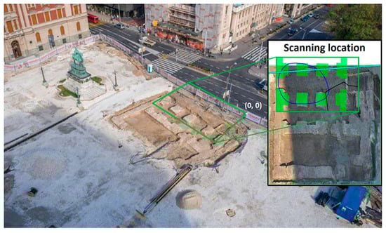 The survey area was almost 250 m2 wide and it was defined based on the available documents and information [,,], including the geodetic maps mentioned in Section 2 (Figure 2).