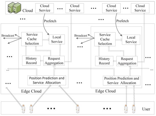 Based on MEC model, researchers have done much research work. The existing research mainly focuses on computation offloading [,], Yang et al. [] proposed to use the user’s mobile mode and service access mode to predict the distribution of user requests in order to minimize the problem of user access delay and service provider cost; and then adjust the service layout and load schedule on the network according to the prediction result. Tan et al. [] propose a generic model for minimizing job response time in the edge-cloud, where jobs are generated in any order and time on the mobile device. And the first online job scheduling algorithm in the edge-cloud is proposed, called OnDisc algorithm. Wang et al. [] studied how to offload computing job to deal with the dynamic changes of these networks in the dynamic micro-cloud. The goal is to find the best layout for the instance to minimize the average cost. The paper proposes an offline algorithm that solves the optimal computation offloading problem in a specific look-ahead time window. Wu et al. [] developed an analytical queueing model for delayed offloading systems with intermittent connectivity. This method effectively improves the success rate of computing offload in a mobile environment. Wu et al. [] also proposed an energy-efficient offloading-decision algorithm based on Lyapunov optimization. This algorithm effectively reduces the average energy consumption on mobile devices. Although those solutions for computation offloading can effectively solve the problem that mobile device has limited performance. However, the above research does not give a reasonable solution to the problem that what kind of service (database/lib library) should be cached by the edge-cloud to satisfy the near-end service request. Xu et al. [] studied the dynamic service caching problem in dense cellular networks with MEC enabled. He proposed an OREO algorithm that can jointly optimize dynamic service caching and computational offloading to address many key challenges in MEC systems, including service heterogeneity, unknown system dynamics, spatial demand coupling and decentralized coordination. Chen et al. [] studied collaborative service caching in MEC-enabled dense small cell (SC) networks. He proposed a collaborative service caching algorithm to solve the service caching problem in a centralized way. However, these existing service cache studies do not consider user mobility. Since users are mobile, the connected edge-cloud will change, and stateful migration will reduce the system performance. Therefore, we need to study a mobility-aware service caching mechanism.