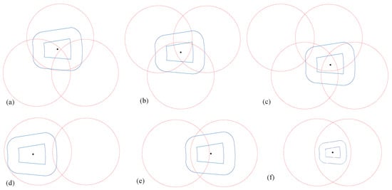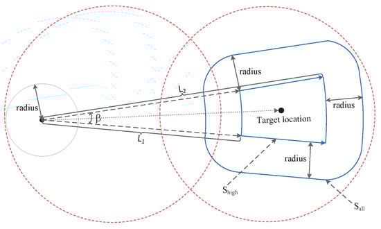 As shown in Figure 4, the blue area is the possible position after the user moves, radius is the size of the position precision, represented as ;  represents the shortest moving distance (estimated service response time * minimum moving speed), and  represents the maximum moving distance (estimated service response time * maximum moving speed).  is the angle of direction error twice. The position accuracy and speed accuracy provided by the existing positioning system (including the one under construction) are given in Table 1. In this paper, we use GPS performance parameters, and all the above performance parameters are civil performance parameters [].