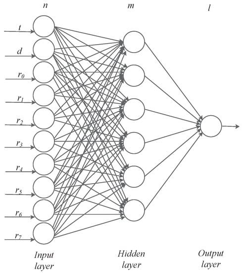 As shown in Figure 7, the BP network that we constructed consists of an input layer, a hidden layer and an output layer. It is a  three-layer BP network model. When constructing a BP neural network model, it is important to determine the number m of hidden neurons. Excessive number of hidden layer neurons will increase the amount of network calculation and easily cause over-fitting problems; if the number of neurons is too small, it will affect network performance and will not achieve the expected results. The number of hidden layer neurons in the network is directly related to the complexity of the actual problem, the number of neurons in the input and output layers, and the setting of the expected error. In this paper, we use the following empirical formula to select the number of hidden layer neurons: