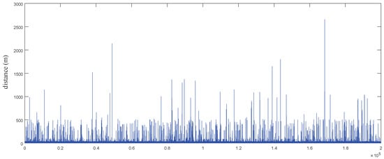 The dataset is represented by a sequence of time-stamped points, each of which contains the information of latitude, longitude, high, speed and heading direction, etc. To construct the experimental data set, we use the spherical body distance formula to calculate the distance between adjacent points. Here, we take 6,371,000 m as the radius of the earth. We refer to the trajectory of adjacent points in the data set as the moving path, and randomly select 200,000 moving paths. The moving distance distribution is shown in Figure 8. The y-axis represents the moving distance and the x-axis represents the track number. It can be seen that the length of most trajectories does not exceed 1 km.