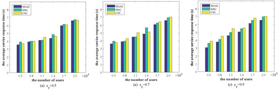 We observe that when the number of users increased from 5000 to 20,000, the average service response time has increased. Especially when the number of users exceeds 14,000, the average service response time increases significantly. This shows that after the number of users exceeding the edge server capacity, many service requests are forwarded to the remote cloud for execution. Moreover, it can be seen in Figure 10c, the average service response time when  is significantly less than the other two cases. This means that our algorithm performs better when the service request obeys long-tailed distributions.