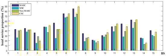 As shown in Figure 11, the MASC algorithm is significantly better than the MSC algorithm, with an average 45% higher than the MSC algorithm. Compared with the CSC algorithm, the local service proportion of the MASC algorithm is higher in most locations. Only in a few locations, such as BS 4,7,10,11, the local service proportion of our algorithm is slightly lower than the CSC algorithm. This is caused by the service load being forwarded to nearby cooperating edge servers. However, this significantly increases service response time (as shown in Figure 10). And the local service proportion of our proposed MASC algorithm is 15.19% higher on average than the CSC algorithm. Therefore, our algorithm is still better than the CSC algorithm.