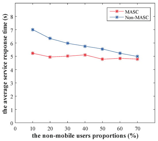 As shown in Figure 12, the average service response time of the MASC algorithm is stable at different proportions. And the service response time of Non-MASC algorithm is significantly larger than the MASC algorithm when the non-mobile user proportion is less than 70%. The Non-MASC algorithm lacks mobility prediction and service allocation, resulting in many service requests being executed in non-local areas or retransmitted. Therefore, our algorithm has good performance for environments with high user mobility.