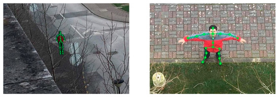Among the main problems of a camera dependent solution, the quality and clearness of the captured image occupy a privileged position thanks to motion blur, prop flicker, UAV vibrations, low spatial resolution itself and other environmental related limitations (e.g., solar light reflection, fog, humidity particles) [5,6]. The detection of a person from an aerial view becomes even trickier since different angles mess with the proportions and shape of the human skeleton (Figure 1). The out-of-the-box drones available in the consumer market and their hardware are usually inaccessible, which means that it is not possible, through the conventional ways, to embed a visual recognition system among the existent functionalities. Moreover, the components are not ready for the additional overhead of an extra task. Related to the image processing itself, visual recognition is a very onerous task, which means that to get the best performance from the deep-learning models we need a device with powerful computing power, an attribute directly proportional to the price of the equipment. The choice of the Deep Neural Networks (DNN) architecture and the respective model training are crucial to overpass this last challenge that is focused on performing human detection through a UAV equipped with a low-cost and low-performance computing device and camera.