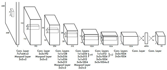 The first CV algorithms that appeared in this area consisted of analyzing the full images without almost no treatment or manipulation [20]. Applying an untreated input to the neural networks tends to be very exhaustive and time consuming [21]. Thus, a new method to perform object detection and recognition was created: Convolutional Neural Networks (CNNs). In CNNs, a specific set of operations is applied to the image input to prepare and extract its most important features. The preparation of the pictures differs for each model and is commonly based on convolution and pooling layers [22]. For instance, the input passes by one or more layers to create multiple outputs that highlight specific patterns (e.g., contours, color variations). The output of these layers is finally applied to the fully connected neural network layers to predict the score of each classification possibility. During the training and validation phases, the same procedures performed in the convolutional layers are applied before the processed of the data by the neural network. In the final, as the input is processed and normalized, the neural networks tend to be smaller, increasing the speed of the whole algorithm [22]. There are many different frameworks and models available to implement CNNs. The most significant differences between these algorithms are related to the number and type of the layers in the network’s architecture. The architecture of the You Only Look Once (YOLO) model is represented in Figure 2 [21]. This model is pre-trained with the ImageNet dataset to tune each of the layers according to the labels of the dataset. Among the known layers, the most common are convolutional and minimum, maximum, and average pooling. In the first, a convolutional matrix sliding is applied across the image, while the remaining reduce the size of the image by calculating the minimum, maximum or the average information of a group of pixels in each image area [4]. The difference in the number and size of each layer has a direct impact on the performance of the object detection process. Minding this fact, Google created the MobileNets framework, intended to run in embedded and mobile devices. This network can be used in different systems and presented better results when used with the algorithm Single Shot Detector (SSD) [23]. The combination of these two allows the creation of lightweight systems for object detection, deployable in embedded devices such as Raspberry Pi [24].