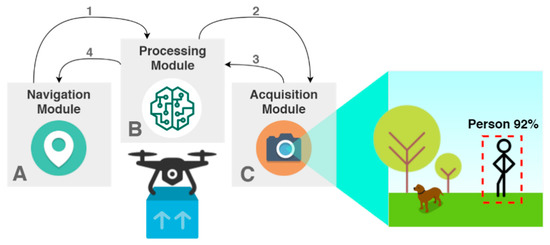 This system is made of three different modules, embedded in a UAV, that cooperate to make the human detection work as specified, through a camera and deep-learning algorithms (i.e., CNN), as represented in Figure 3. The first corresponds to the Navigation Module (A), responsible for autonomously flying the drone to a specified geolocation and perform punctual moves or rotations during the delivery phases. This autonomy is based on a mission planning that allow the setting of the course of a UAV to its destiny through GPS coordinates. Then, we need the Image Acquisition Module (C) that is made of a camera to capture images that are passed to the Processing Module (B), which is responsible for running the ML algorithms specified for person detection.