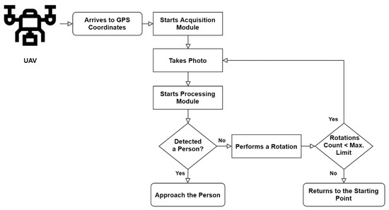 This architecture fulfils the objective of the proposed system, intended to work in the following scenario. When the UAV arrives to the GPS coordinates defined in the delivery mission as the receiver’s location, the Navigation Module notifies the Processing Module (1) to ask the Image Acquisition Module to turn on the camera (2). The first step corresponds to the acquisition of an image to be posteriorly handled by the Processing Module (3). Regarding the best-case scenario, the Navigation Module receives the location of a person to begin the approach and start the next phase of the delivery (4). On the other hand, if this module does not detect the presence of a person, the vehicle will rotate along its vertical axis until the Processing Module detects one person. The rotation interval depends on the Angle of View of the camera. This is performed cyclically until a potential receiver is detected. After performing a pre-determined amount of rotations, if the vehicle did not detect one person, it should go back to the home point and trigger an alert that it was impossible to find the delivery site. The flowchart of the solution is presented in the Figure 4, representing and describing the steps that the UAV accomplishes from the GPS coordinates definition until the person’s approach.