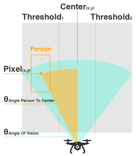 This equation represents the estimation of the angle of the person () relatively to the horizontal center of the camera in degrees from the following input: camera resolution in the x axis (in pixels), the x value of the center of the person (in pixels), and the horizontal angle of vision of the camera (in degrees). As we know that pixels correspond to degrees and we are close enough to the person based on the predefined GPS coordinates, we can infer the angle between the center of the person and the center of the UAV (Figure 6).