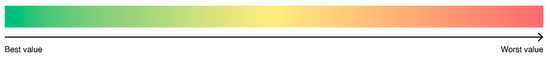 Gradient that represents the colors used as visual interpretation for the TP and average confidence values represented through tables. From the left to the right, the quality of the values decreases—the leftmost color (i.e., green) represents the best results, while the rightmost one (i.e., red) corresponds to the worst value.