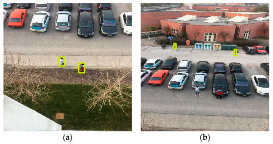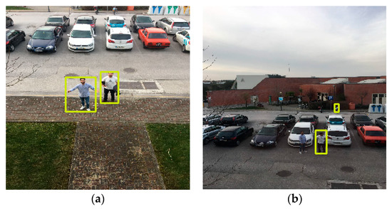 The first scenario comprehends the tests for the validation of the implementation in terms of functionalities and was exposed to an exhaustive environment with many different elements, including the presence of cars, traffic signals, trash bins, and multiple persons. In this scenario, we acquired the images with an iPhone 6S Plus and used a Raspberry Pi 3 for posterior processing. The pictures were captured from the first and second floors of a building with heights of 4.5 and 10 m, respectively. In this situation, it was possible to attest the purpose of the algorithms and perceive the variation of the two models, SSD and SSDLite, according to the different heights, distances, and environments.