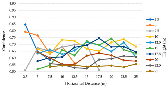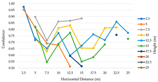 Considering the results obtained, a pattern is noticeable between the two different daytimes. The morning daytime did present lower accuracy than the afternoon condition. In the morning, the SSD did not find persons for the 7.5 and 10 m height, while in the afternoon it just did not detect on the 10 m height. SSDLite, though, found TP values on all the heights, despite having lower accuracy in the morning. One of the justifications we concluded with these results comprehend the different brightness conditions that can obfuscate the person or reduce the contrast between the person and the environment (e.g., in the morning, the sun light is brighter than in the afternoon).