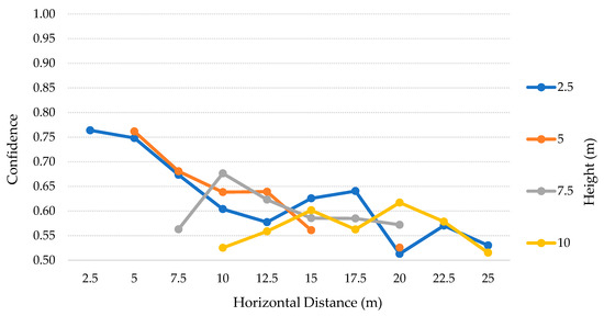 For the first test scenario, the pictures are captured from two different heights in a complex environment with people and other elements of different types. While the SSD model took around 4.5 s to process each image, the SSDLite just took approximately two seconds. The two models performed well on both heights for the lowest distance, but then highly decreased their recall and confidence values. Although the SSDLite model could detect more individuals on the furtherer distances, it also started identifying other objects as person (i.e., FP). The following tests are performed in a scenario closer to a real situation where a quadcopter simulates the approach to the yard of a house from different heights and distances. With the camera of the DJI Phantom 4 and the SSD model, the person was not detected above 17.5 m. On the lower heights, from 2.5–7.5 m, the person was out of the camera’s range. We could conclude that for this model and camera, the best height is 10 m, which resulted in a recall of over 90%, consisting on 22 TP out of 24 people. In the same circumstances, the SSDLite found more people, while having lower confidence values and identifying other objects as if they were a person on the heights above 12.5 m, lowering the precision. In the cases where we tested the heights of 5 and 10 m, this model got 100% recall. According to the results of the second test scenario, the low-cost alternative, implemented for the third test scenario, was tested for heights up to 10 m. This height seemed to be the best point for higher recall, confidence, and no FP. Then, similarly to the previous tests, the SSD achieved lower recalls than the SSDLite model but higher confidence values. This means that when SSD detects a person, it is more likely to be a real person than a person identified by the SSDLite. However, the first model just got a maximum of ~33% recall for the 5 m height while the last model got recalls between ~59% and ~76%. In this test scenario, thanks to the camera’s wider field of view, we could capture the person in more distances for the same height, whereas the camera of the Phantom 4 could only capture the body of the receiver in closer distances. In other way, the footages of the Phantom 4, generally had better confidence values for the same height and distance conditions.
