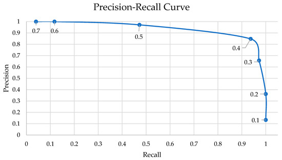 Precision–Recall curve for the fifth test scenario, indicating the ratio between the precision and recall values for different threshold values: from 0.7 to 0.1—left to right.