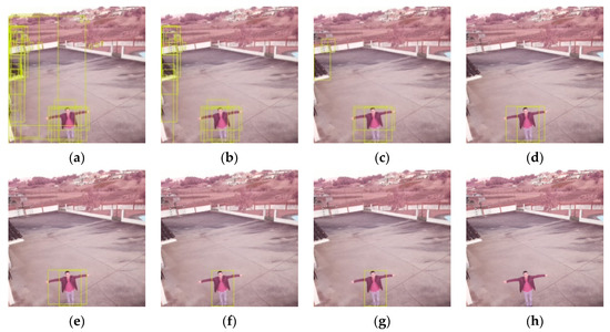 Prediction results for different confidence thresholds, identified by yellow rectangles: (a) 0.10 threshold; (b) 0.20 threshold; (c) 0.30 threshold; (d) 0.40 threshold (e) 0.50 threshold; (f) 0.60 threshold; (g) 0.70 threshold; (h) 0.80/0.90 threshold.