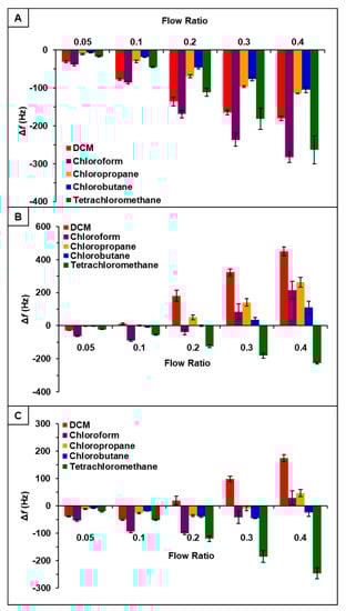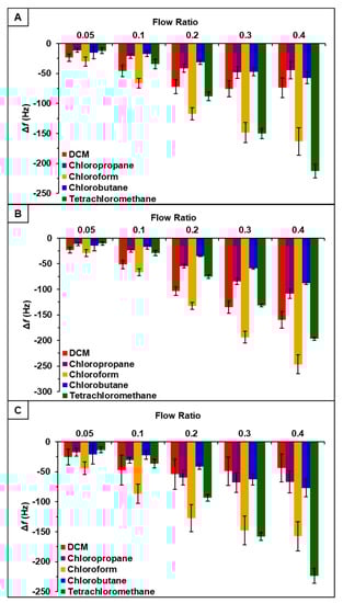 It was hypothesized that incorporation of PDMS with phosphonium ILs would increase sensor response to chlorinated compounds [22]. Thus, the vapor sensing properties of [P66614][DBS]-PDMS, [P66614][BS]-PDMS, and [P66614][OBS]-PDMS were evaluated using similar parameters as ILs studies. Briefly, three QCM sensors coated with respective IL-polymer composites were inserted into QCM-D chambers and exposed to the same set of chlorinated VOCs at identical flow ratios. Similar to IL studies, sensors were exposed to VOCs at indicated flow ratios for 3 min intervals for a total exposure time of approximately 15 min with three replicate measurements. Sensor responses for [P66614][DBS]-PDMS, [P66614][BS]-PDMS, and [P66614][OBS]-PDMS are presented in Figure 2 expressed as change in frequency () versus flow rate ratios. All sensors were found to be reusable, which is consistent with each sensor exhibiting a stable baseline and reversible sorption, as shown in Figure S10. Moreover, each sensor produced analyte specific response patterns as compared to each other, as well as to their IL counterparts.