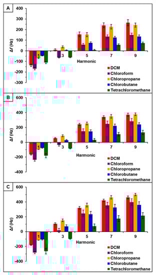 [P66614][OBS]-PDMS sensor response to chlorinated VOCs at multiple harmonics at (A) 0.2 flow ratio, (B) 0.3 flow ratio, and (C) 0.4 flow ratio. Error bars represent standard deviation for three replicate measurements.