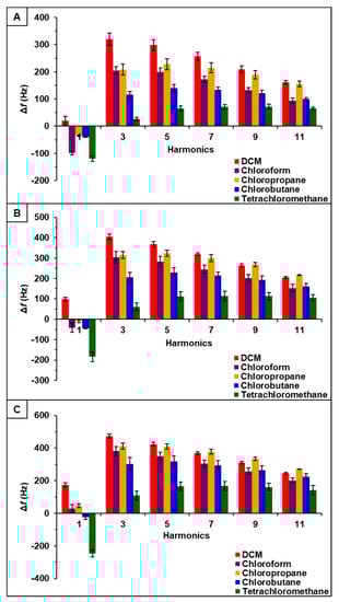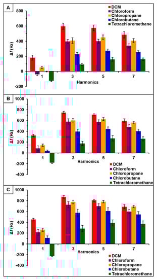 where is change in resonance frequency, is harmonic number, is mass sensitivity designated as 17.7 ng cm−2 Hz−1 for the 5 MHz AT-cut crystal used in this study; is film density, and is film thickness [19]. Thus, the harmonic, thickness, and viscoelasticity of each film will have an effect on sensor response. Harmonics are generated using fundamental frequencies at odd multiples. The quartz crystal resonators (QCRs) used in this work are capable of seven harmonics. In this regard, each harmonic response is recorded and employed as a sensor. For QCM based MSAs and VSAs, the selectivity and sensitivity depend on the coating material.