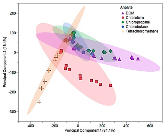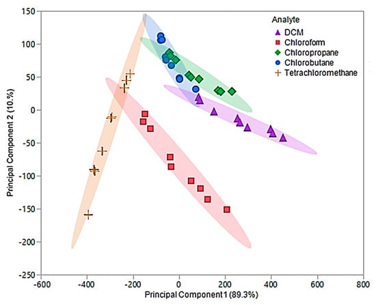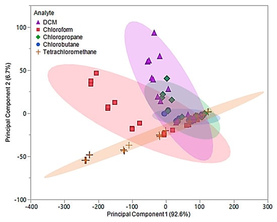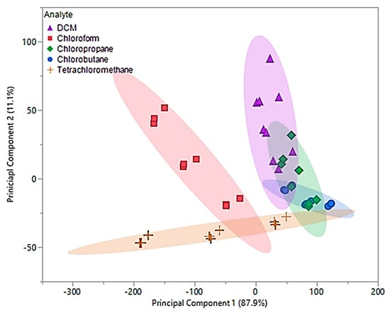 In this examination, the first two principal components accounted for 99.6% of the total variability in the three predictors and represented the same factors as the original components. The optimized first principal component accounted for 89.3% of the variability, while the second component accounted for 10.3%. An optimized PCA plot is depicted in Figure 9, where enhanced visual separation between tetrachloromethane, chloroform, and DCM is provided. Nonetheless, poor visual separation persisted between chlorobutane and chloropropane of the optimized principal components.