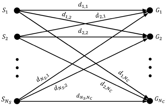 Bipartite graph model for the task distributing problem of assigning mobile destinations for sensor nodes. and represent the set of sensors and grid points, respectively. The weight of the edge denotes the distance between and .