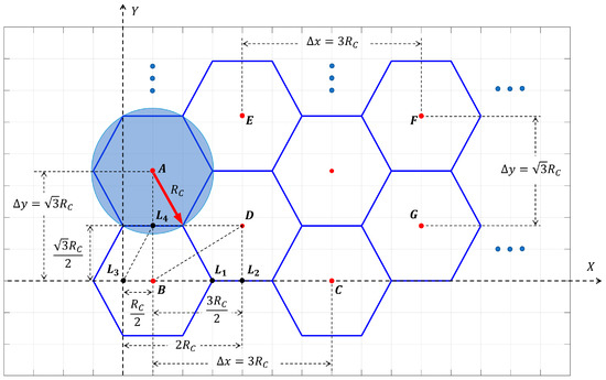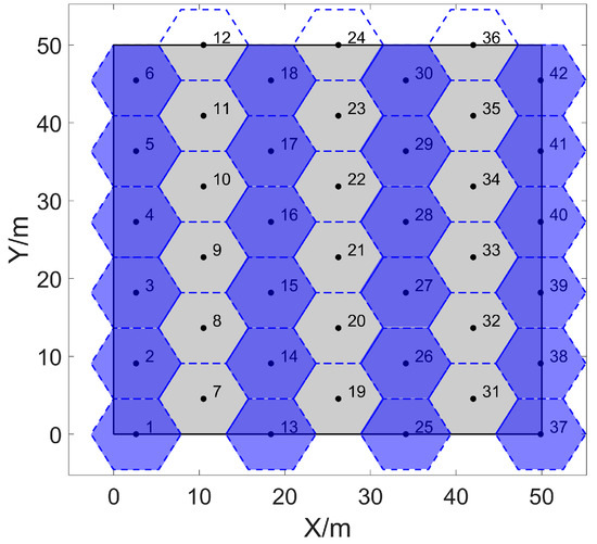 By using cellular grids with a radius of to stack with a size of seamlessly, the minimum number of cellular grids can be calculated by Equations (5)–(7), which is . The stacking effect is shown in Figure 3, the blue cellular grids are the first type of grids based on the - grid, and the remaining cellular grids are the second type of grids based on the - grid.