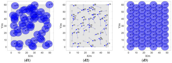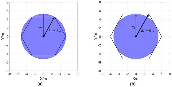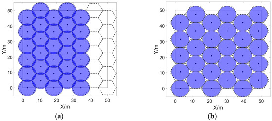Regarding the sensor’s perceived radius as the radius of the cellular grid, the minimum number of cellular grids required for stacking seamlessly can be calculated by Equations (5)–(7), which is also the minimum number of sensors required to cover completely.