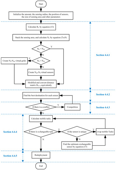 Resource constraints are another major feature of WSNs, and also a major bottleneck that hinders large-scale redeployment. Given that sensors are small embedded system devices, which are usually equipped with radio transceivers, microcontrollers, and energy supplies (usually batteries), their energy supply is often difficult to achieve due to the limitations of WSN application scenarios. This can cause irreparable disasters in an entire network once the nodes fail due to energy exhaustion. Therefore, it is necessary to reduce the node energy consumption as much as possible and prolong the working cycle to the greatest extent [5]. The movement of sensor nodes and signal transmission between them are two main aspects of energy consumption during redeployment, and the proportion of the former is higher than that of the latter for mobile sensors. Accordingly, in addition to the coverage enhancement, the optimization of moving distance is also an essential factor for mobile WSNs [6].