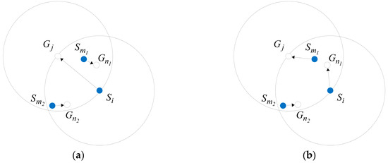 Schematic diagram of task exchange when multiple sensors meet the task exchange conditions. (a,b) are the schematic diagrams before and after task exchange, and the optimal exchange scheme of is determined by the theorem of task exchange.