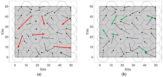 Taking a of as an example, when calculating the movement scheme of sensors with a perceived radius of , the comparison before and after the task exchange is shown in Figure 9, and it can be seen that the distant moving tasks as shown by red arrows in Figure 9a are balanced in Figure 9b, which is shown by green arrows.