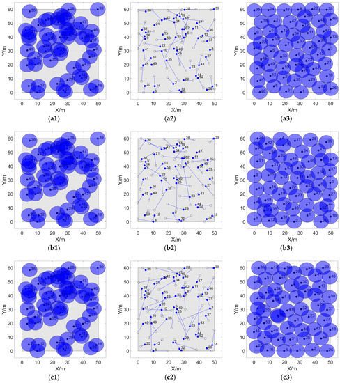 The size of the cellular grid will be adjusted in the range shown in Figure 4 according to the number of sensor nodes. When the condition of is satisfied, as shown in Figure 6b, will be increased with the decrease of , the distance between sensor nodes will be increased, and the redundant coverage area will be effectively reduced; when the critical condition is met, the optimal cover effect can be achieved without adjusting the size of the cellular grid; when the is satisfied, the coverage rate can be increased to in spite of few sensors being redundant, hence there is no need to adjust the cellular grid size.