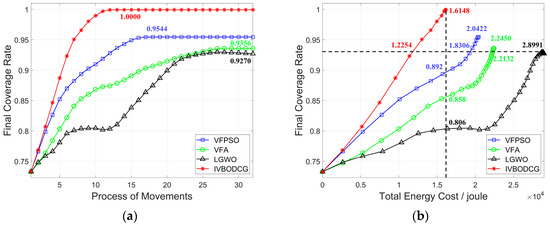 Coverage rates and energy cost of four algorithms. (a) shows the relationship between final coverage rate and process of movements. (b) shows the relationship between final coverage rate and total energy cost. Compared with VFA, VFPSO and LGWO, IVBODCG can achieve the optimal coverage effect with the least energy cost and the fewest rounds of movements.