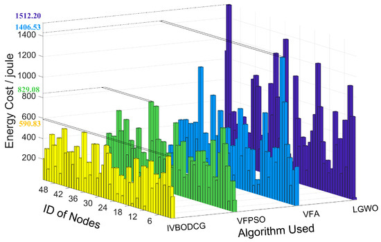 Energy cost for 53 sensors of IVBODCG, VFPSO, VFA and LGWO. The yellow, green, light blue, and dark blue bar graphs are the energy cost of the 53 nodes of four algorithms, respectively, after redeployment. The bars from right to left in a given bar graph represent the energy cost of nodes 1–53 of the corresponding algorithm.