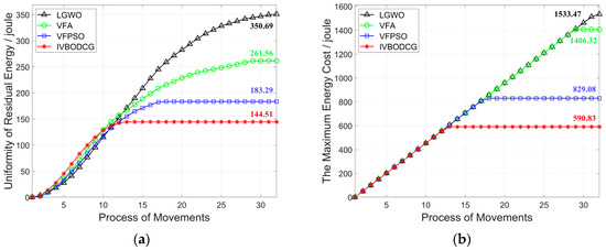 Comparison of MEC and URE of nodes of four algorithms. (a) shows the relationship between uniformity of residual energy and process of movements. (b) shows the relationship between the maximum energy cost and process of movements. Compared with LGWO, VFA and VFPSO, the IVBODCG’s MEC and URE is the best after the final round of movement.