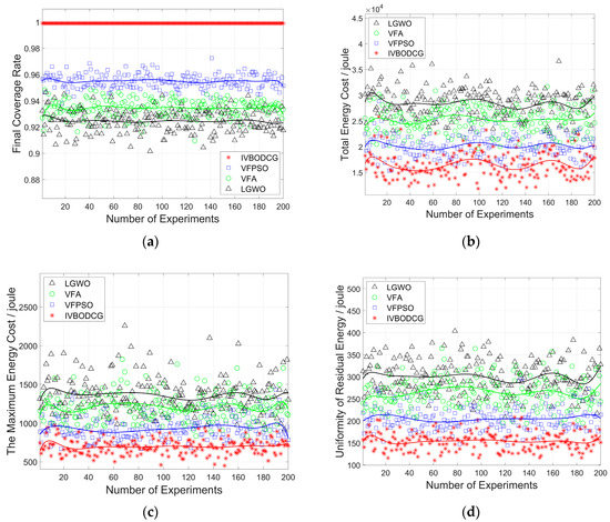 Comparison of energy cost and final coverage rate by 200 independent experiments. (a–d) show the final coverage rate, total energy cost, the maximum energy cost and uniformity of residual energy of four algorithms in 200 independent experiments, respectively. The curve is the fitting result of the tenth polynomial of the data points.
