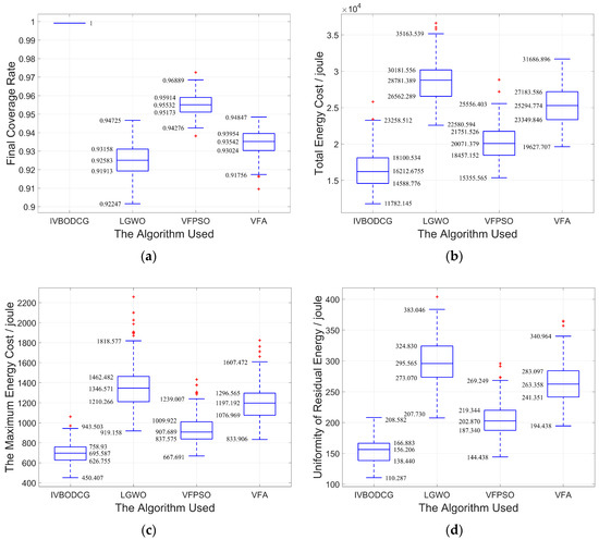 Comparison of statistical results of the four algorithms from 200 experiments. (a–d) show the statistical results of final coverage rate, total energy cost, the maximum energy cost and uniformity of residual energy of four algorithms, respectively.