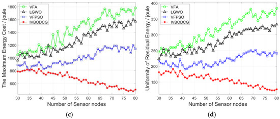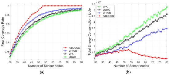 Considering that the actual number of sensors may not be the optimal number which is 53, a vertical comparison is made by changing the number of sensors in order to test the universality of our proposed strategy. Figure 16 compares the performance of four algorithms when the number of sensors varies from 30 to 80. It can be seen from Figure 16a that the FCR of the four algorithms is increasing with the increase of the number of sensors, and our proposed strategy is superior than that of LGWO and VFA when the number of sensors is the same, and FCR of IVBODCG reaches 100% when the number of sensors exceeds 53. Figure 16b shows that TEC of LGWO, VFA and VFPSO increases obviously with the increase of the number of sensors, and that of our strategy is slightly increasing before the number of nodes increases to 53, and is lower than that of LGWO, VFA and VFPSO when the number of sensors is the same. Figure 16c,d indicate that the MEC and URE of sensors of LGWO and VFA is gradually increasing with the increase of the number of sensors, and that of VFPSO is slightly rising while IVBODCG is constant and even gradually reduced when the number of sensors is greater than 53, and it also has superior performance when the number of sensors is the same.