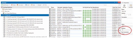 In KNX topology, there are the following four available communication media for the actual transmission of data telegrams between individual KNX modules: Twisted Pair (TP) (also known as KNX bus), powerline (PL), radio frequency (RF), and ethernet (IP). Each communication medium can be used in combination with one or more configuration modes. Economical operation and comfort in the control of operational-technical functions are the main priorities of implementations within family houses. Therefore, TP was selected as the backbone structure of this implementation (Figure 2).