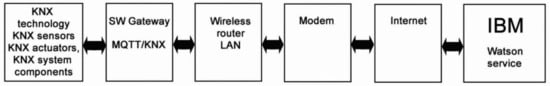 The connection of KNX technology and IBM cloud technology is ensured in this work by our developed software [], which enables the communication between IBM Watson IoT platform and KNX smart installation (Figure 4). Message queuing telemetry transport (MQTT) protocol is used as a communication protocol.
